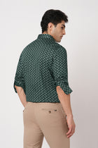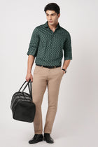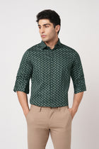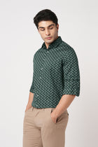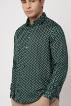 Make a bold statement with this Men’s Tailored Fit Teal Printed Shirt featuring a stylish chevron pattern on smooth satin cotton fabric. The distinctive geometric print adds modern character, while the satin weave provides a soft luxurious feel. Designed with full sleeves and a spread collar, it delivers standout style with refined comfort.