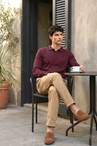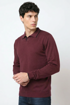 This men's wine-colored flatknit winterwear features a regular fit with a clean, plain design for timeless style. Crafted for everyday comfort, its knitted construction offers breathability and a polished finish. Ideal for casual, office, or evening wear. Pair with denim, chinos, or layer under a gilet for a smart yet relaxed fashion look.
